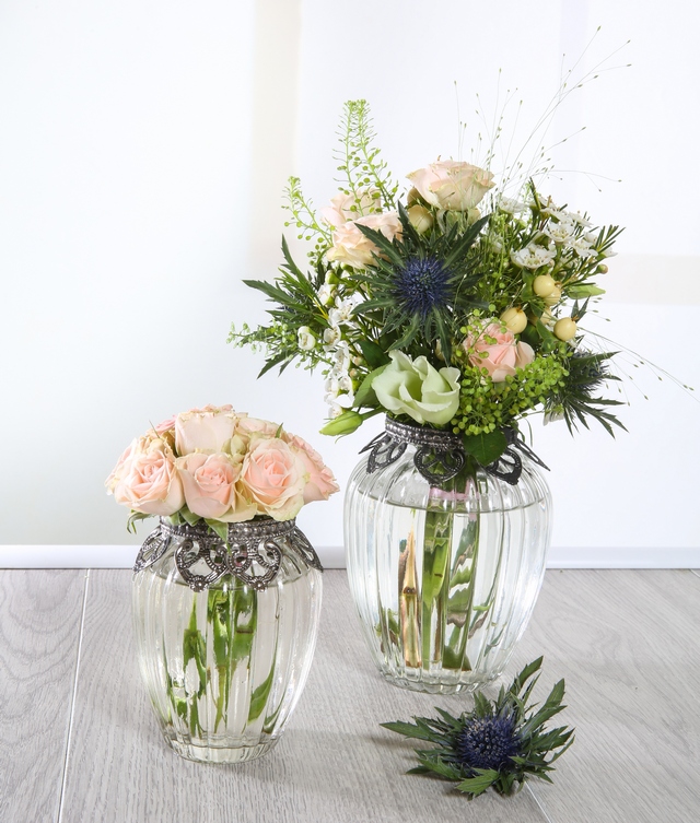 Blush tones are accented by stunning greens and purples to make our Sava arrangement a stunning gift. Bold Thistle and green Lisianthus compliment Roses and Hypericum, in glass urns
